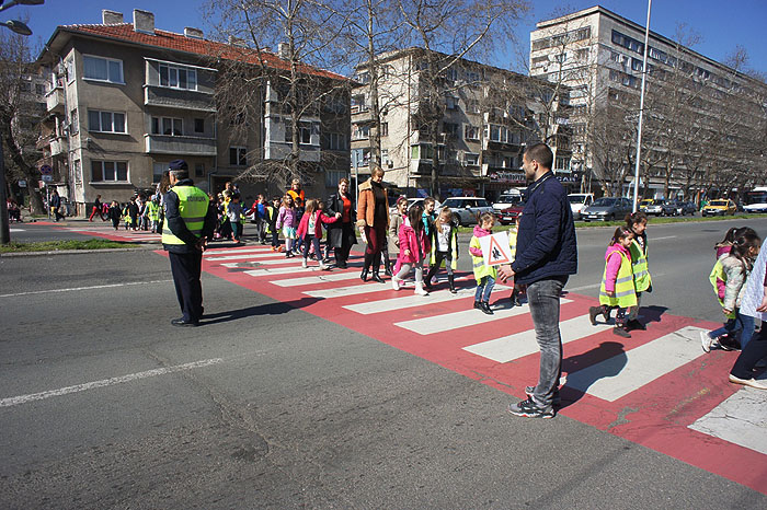 Бъдещите първокласници от четирите подготвителни групи, съвместно със служители от сектор "Пътна полиция" към ОД на МВР - Бургас, проведоха тренировъчно занятие за реално пресичане на пешеходна пътека на бул. "Демокрация".