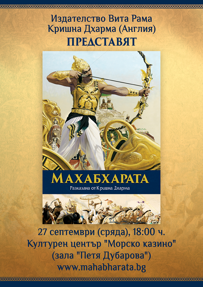 На 27.09.2017 г. (сряда) от 18.00 ч. в зала "Петя Дубарова" на Културен център "Морско казино" ще бъде представено ново издание на класическия санскритски епос "Махабхарата". Сюжетът е увлекателен, а само по себе си произведението е ценен източник на информация за културата и религията на древна Индия.