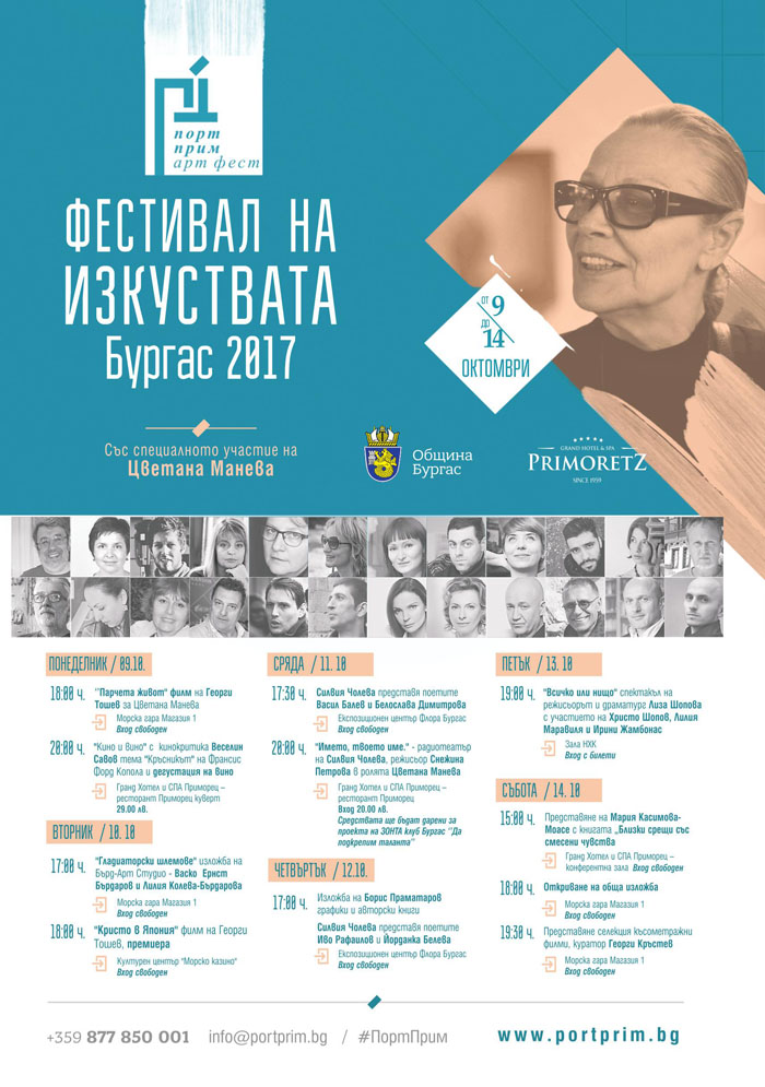 На 9 октомври голямата ни актриса Цветана Манева ще открие пилотното издание на Порт Прим Арт Фест в компанията на журналиста и продуцент Георги Тошев. Фестивалът за изкуства ще стартира с филма, който той създава за нея - "Парчета Живот". Прожекцията можете да гледате в Магазия 1 на Морска гара, от 18,00 часа. Входът за събитието е свободен.