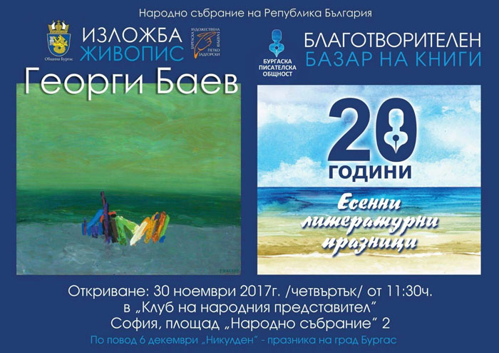 Изложба с платна на Георги Баев и базар с книги на бургаски автори ще бъдат открити в сградата на Народното събрание на 30 ноември.