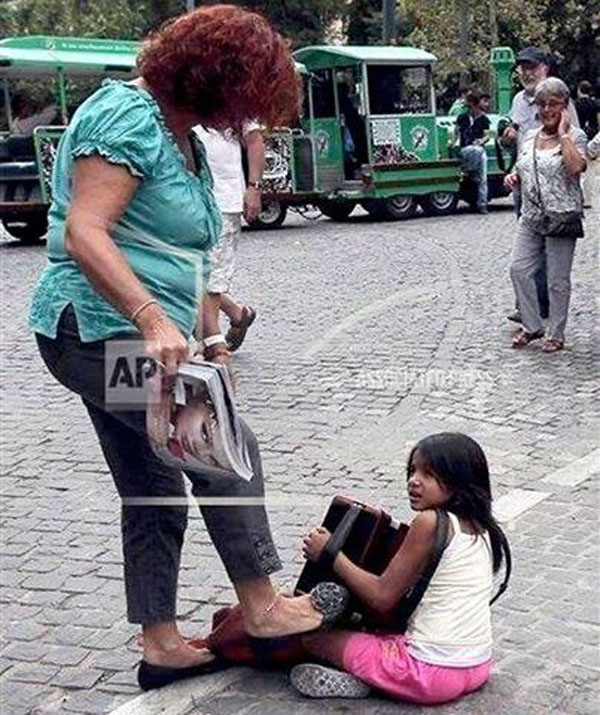 Преди около четири години в интернет излезе снимката на жена, която изрита малко момиче, което проси под Акропола.