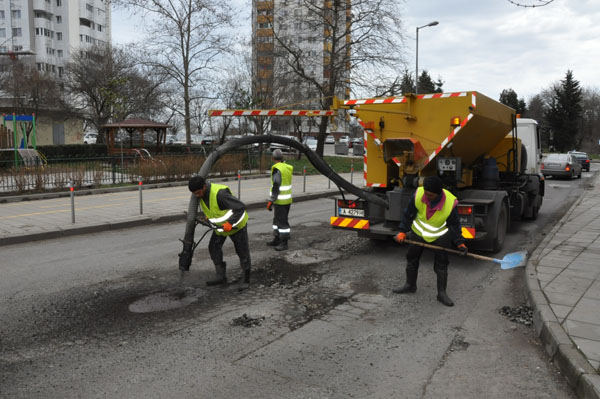 Чрез стандартната за този сезон процедура рязане - фрезоване - запълване със СТУДЕНА смес от битум и добавки - заравняване с вибро плоча, се работи на територията на всички жилищни райони, приоритетно върху най-пострадалите участъци. Почти без почивка работи и джет пачърът, който Община Бургас закупи миналата година точно за такива случаи. Това е мобилна машина, използваща специална технология - продухване на увредената повърхност и впръскване под налягане на асфалтираща смес в подсушеното и почистено място. Този метод е доста по-бърз от стандартния и позволява операцията да се извършва без цялостно спиране на автомобилното движение. Вчера джет пачърът мина по ул. "Транспортна". Днес работи на територията на "Зорница". В следващите дни ще бъде изпратен на други спешни локации из града, най-вече булеварди и кръстовища с натоварен трафик.