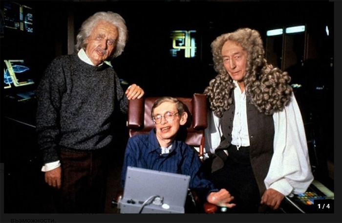 Стивън Хокинг в сериала "Star Let" заедно с актьорите, които играят Айнщайн и Нютон