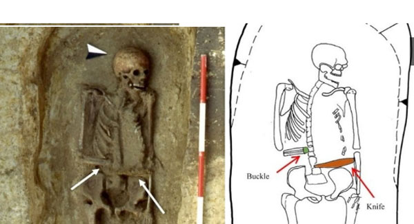 До скелета е лежало острието. Според изследователите това е детайл на протезата, тъй като на другите скелети в некропола ръцете винаги лежат странично от тялото.