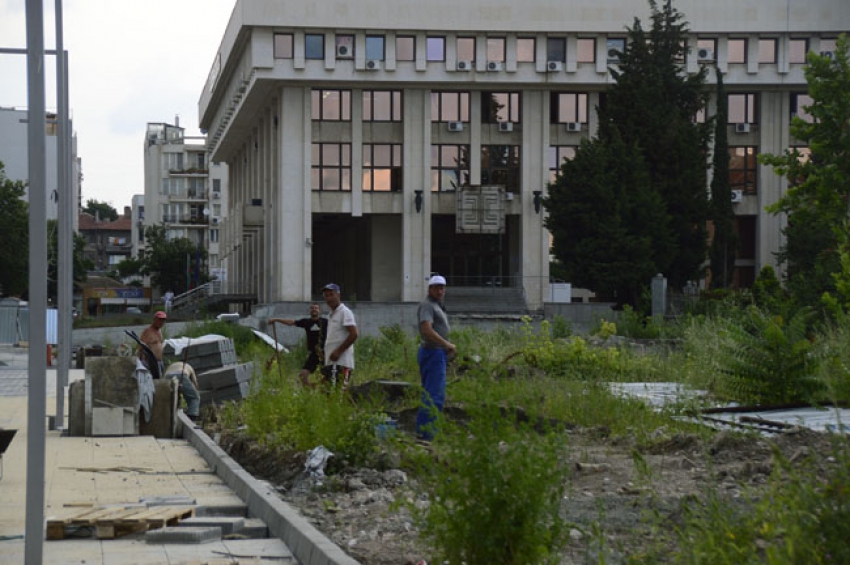 В някои части подреждането на плочките е доста напреднало, затова изпълнителите периодично променят местата, откъдето може да се минава въпреки ремонта.