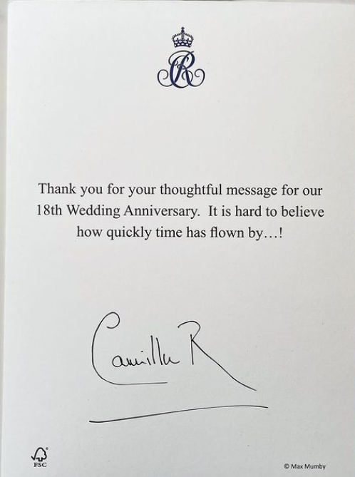 „Благодарим ви за вниманието по повод нашата 18-та годишнина от сватбата“, гласи съобщението, отпечатано на бланката на Камила. „Трудно е да се повярва колко бързо мина времето...!“.