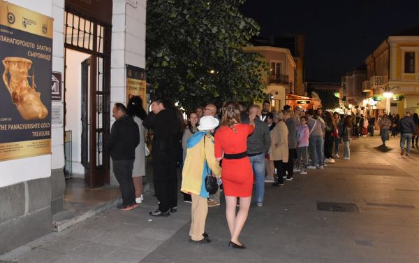 И тази година Регионален исторически музей – Бургас е отличник в Нощта на музеите. Едно от най-важните събития в културната програма на морския град, привлече над 13 000 посетители в своите експозиции. В най-дългата музейна нощ, за периода от 18:00 до 00:00 часа, Археологическата експозиция на музея е посетена от над 7 хиляди души. Несъмнено, важен фактор за този огромен интерес, е гостуването на копието на Панагюрското златно съкровище. Дълги опашки се извиха пред музея с чакащи, дошли специално да се докоснат до уникалните експонати. Изложбата ще гостува в Археологическия музей до 30-ти август, тази година. Тези, които не са успели да я видят в Нощта на музеите, могат да го направят през следващите месеци. Посетителите ще имат удоволствието да се насладят и на изложбата „Рисувана керамика от Аполония – Созопол“. Тя също бе представена в зала – трезор на Археологическата експозиция на РИМ – Бургас. Съдовете, които са от богатата колекция на Археологически музей – Созопол, ще могат да бъдат разгледани до 30-ти април 2025 г.