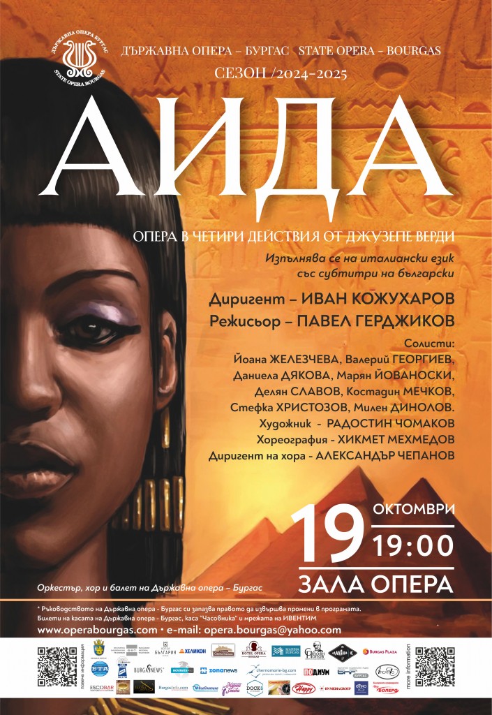Една от най-впечатляващите със своята пищност и мащабност постановки на Държавна опера – Бургас – „Аида“ от Джузепе Верди, в режисьорската версия на проф. Павел Герджиков, ще дари незабравими мигове на досег с популярната опера на почитателите на класическото музикално изкуство – на 19 октомври, събота, от 19 часа на сцената на Държавна опера – Бургас. Спектакълът, който ще пресътвори атмосферата на древния Египет, ще разгърне своята сценична красота и въздейственост, под майсторската палка на именития български диригент Иван Кожухаров, с великолепен артистичен каст.
