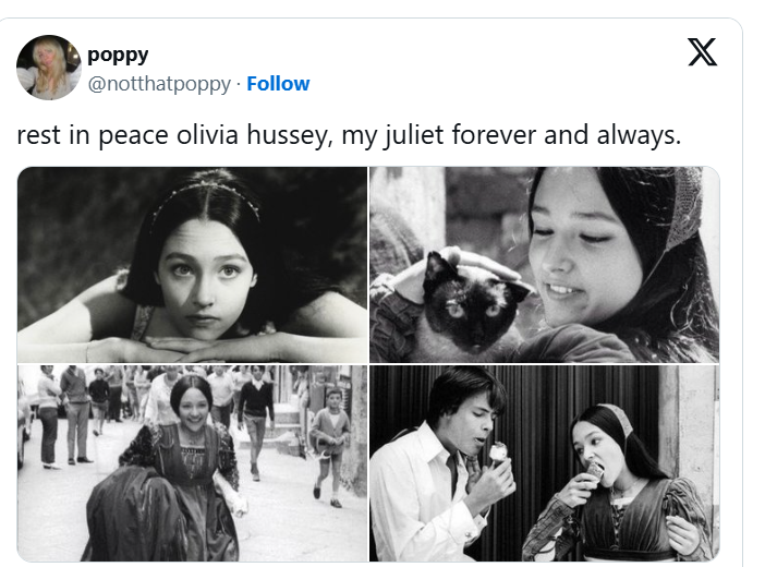 На 73-годишна възраст почина актрисата Оливия Хъси, която изпълни ролята на Жулиета във филма на Франко Дзефирели „Ромео и Жулиета“ от 1968 г. и получи „Златен глобус“.