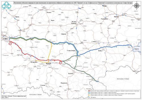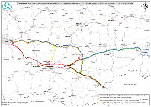 За пътуващите от ГКПП „Капитан Андреево“ в посока София - АМ „Марица“ до пътна връзка на АМ „Марица с АМ „Тракия“ при км 168+215 – по АМ „Тракия“ до п. в. „Стара Загора“ при км 208+181 - по път I-5 Стара Загора – Казанлък до връзка с път I-6 – по път I-6 Казанлък – София;