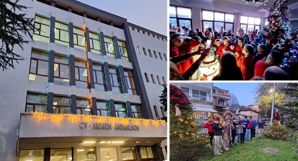 Коледно настроение струи и от ефектно осветената жива елха пред централния вход на сградата. Интересен акцент в екстериора са други две дървета, наподобяващи коледни джуджета с червени шапки, които привличат интереса на малки и големи ученици.
