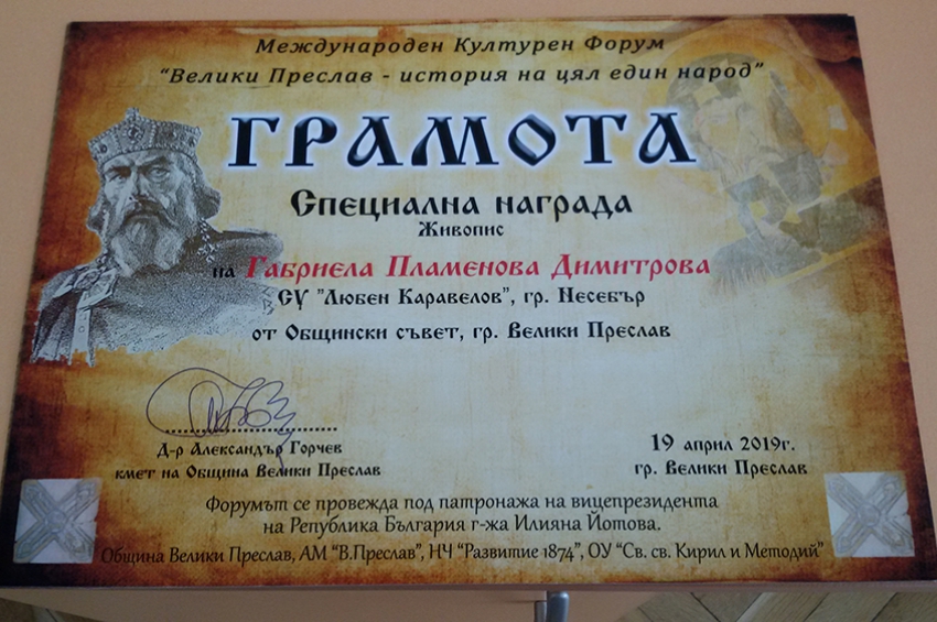 Петокласничката Габриела Пламенова Димитрова спечели специалната награда в категория живопис на Международния културен форум „ Велики Преслав – ист...