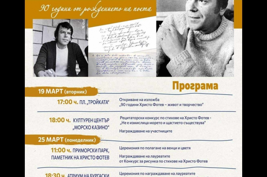 Бургас отбелязва 90 години от рождението на Христо Фотев. От 11 часа пред паметника на поета в Морската градина ще бъдат положени венци и цветя. Та...