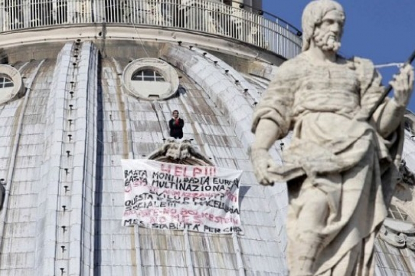 Италианският предприемач Марчело Ди Финицио за четвърти път се покатери на купола на базиликата „Свети Петър” във Ватикана, протестирайки срещу ико...