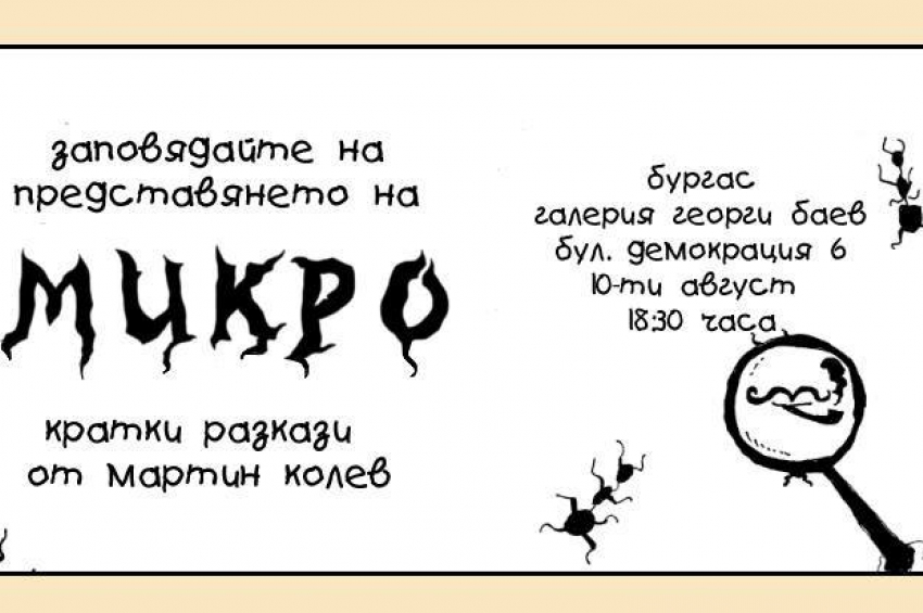 Сряда: от 18.30 в галерия „Георги Баев“ – представяне на книгата „Микро“ (кратки разкази) от Мартин Колев. Мартин Колев е лауреат от Национални...