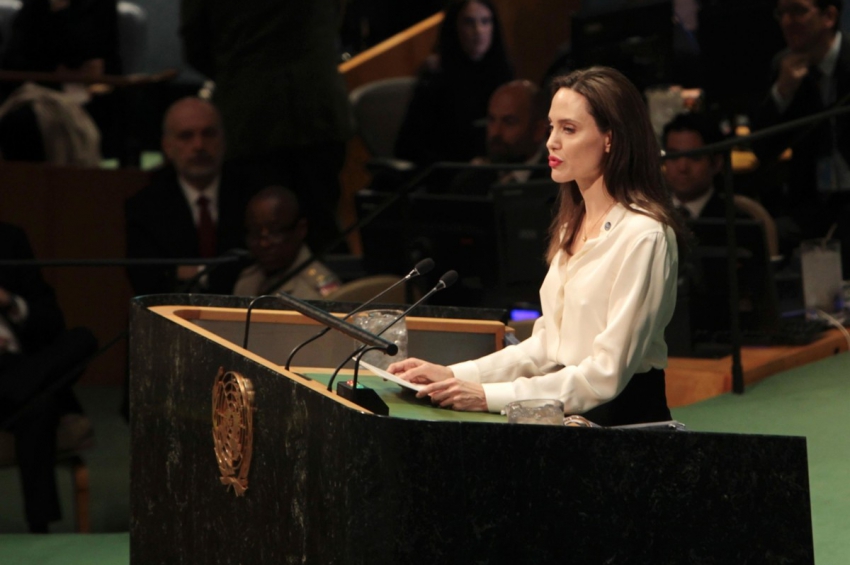 43-годишната Анджелина Джоли като посланик на добра воля на ООН говори на заседание на Общото събрание на Световната организация в Ню Йорк, съобща...