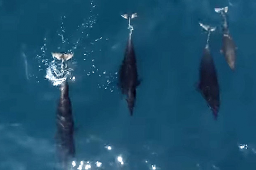 Кадри на които голямо стадо от делфини плуват около гърбат женски кит и малкото му, са заснети от дром край бреговете на Калифорния, съобщава D...