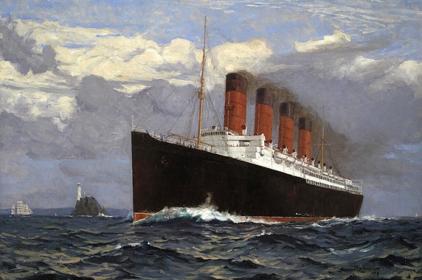 Английския лайнер Лузитания, 1907г, картина на Норман Уилкинсън. Снимка:wikipedia.org 558 г. – куполът на катедралата Света София в Константин...
