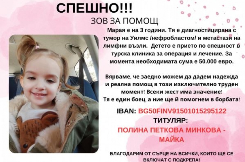 Тригодишната Марая Минкова от Бургас преминава през тежка битка за живота си. Тя е диагностицирана с тумор на Уилмс (нефробластом) с метастази в ли...