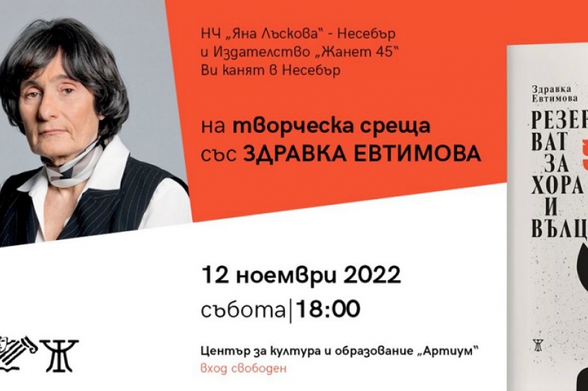 Община Несебър, НЧ „Яна Лъскова 1905“ и издателство „Жанет 45“ организират творческа среща със Здравка Евтимова – една от най-успешните съвременни ...